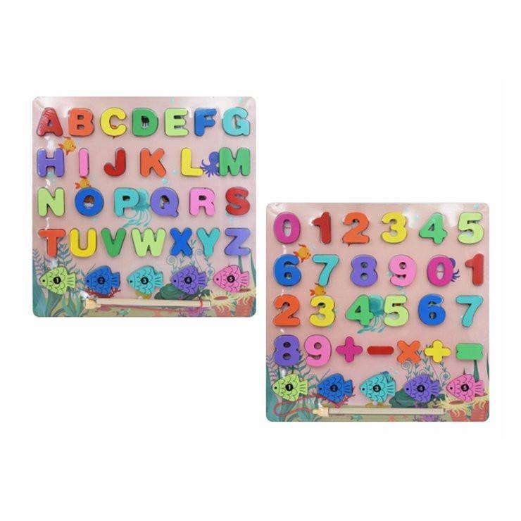 Zábavné učenie. Drevená vkladačka s farebnými písmenkami alebo číslicami. Ak máš učenia už dosť, zabav sa chytaním rybiek na udicu pomocou magnetu. Možnosť výberu z dvoch druhov - číslice alebo veľké písmená. Nevhodné pre deti do 3 rokov.Rozmer - 29,5 x 29,5 x 1cm