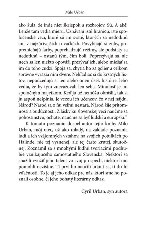 Druhý diel pamätí Mila Urbana voľne nadväzuje na autobiografické dielo Zelená krv (Spomienky hájnikovho syna). Mapuje obdobie od roku 1921 až po príchod autora do Bratislavy v roku 1935. Milo Urban po smrti svojho otca a nezhodách s otčimom predčasne opustil školské lavice, aby sa ako polosirota postaral o seba sám. Stáva sa výpomocným redaktorom v redakcii časopisu Slovák v Ružomberku, neskôr vystrieda viacero redaktorských a úradníckych miest. V roku 1927 mu vychádza román Živý bič, kľúčové dielo slovenskej medzivojnovej literatúry s témou prvej svetovej vojny. Na pozadí autobiografických spomienok autor vyjadruje svoje odmietavé postoje k aktívnej účasti v politike či k pálčivým otázkach v 1. ČSR, napríklad k sociálnej nerovnosti či vzťahu medzi Čechmi a Slovákmi a zároveň predostiera otázku slovenskej svojbytnosti. Druhý diel pamätí Mila Urbana bezpochyby prinesie aj mnohé podnety na diskusiu, nakoľko obdobie, ktoré zahŕňa, formovalo autora ako človeka i ako spisovateľa. Halinda, vymyslená krajina, totiž symbolizuje métu, ku ktorej autor svojím životom i dielom smeruje.