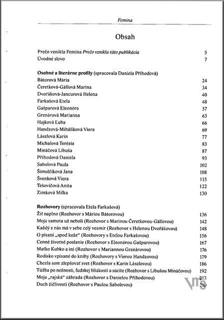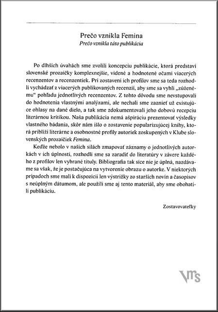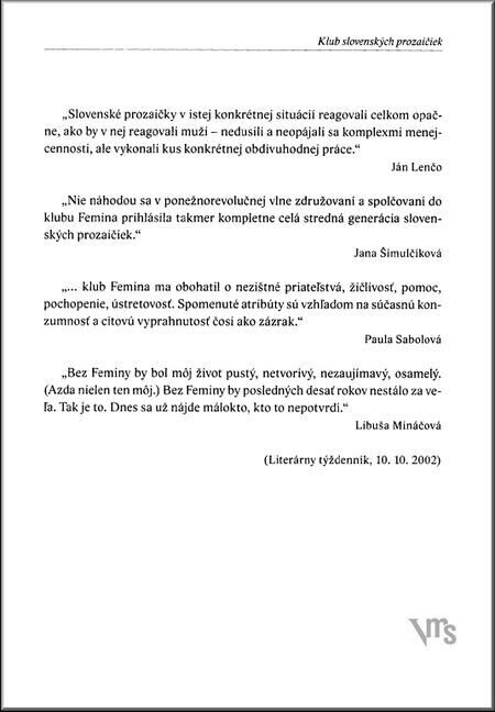 Kniha literárnych a osobnostných profilov spisovateliek združených v Klube slovenských prozaičiek Femina je svedectvom o živote a diele autoriek, ktoré prezentujú tzv. „ženskú“ literatúru a významným spôsobom spoluutvárajú slovenskú literárnu scénu. Dielo určené širokej čitateľskej verejnosti vrátane knižníc a stredných či je obohatené množstvom fotodokumentov z osobného, ale aj literárneho života autoriek.