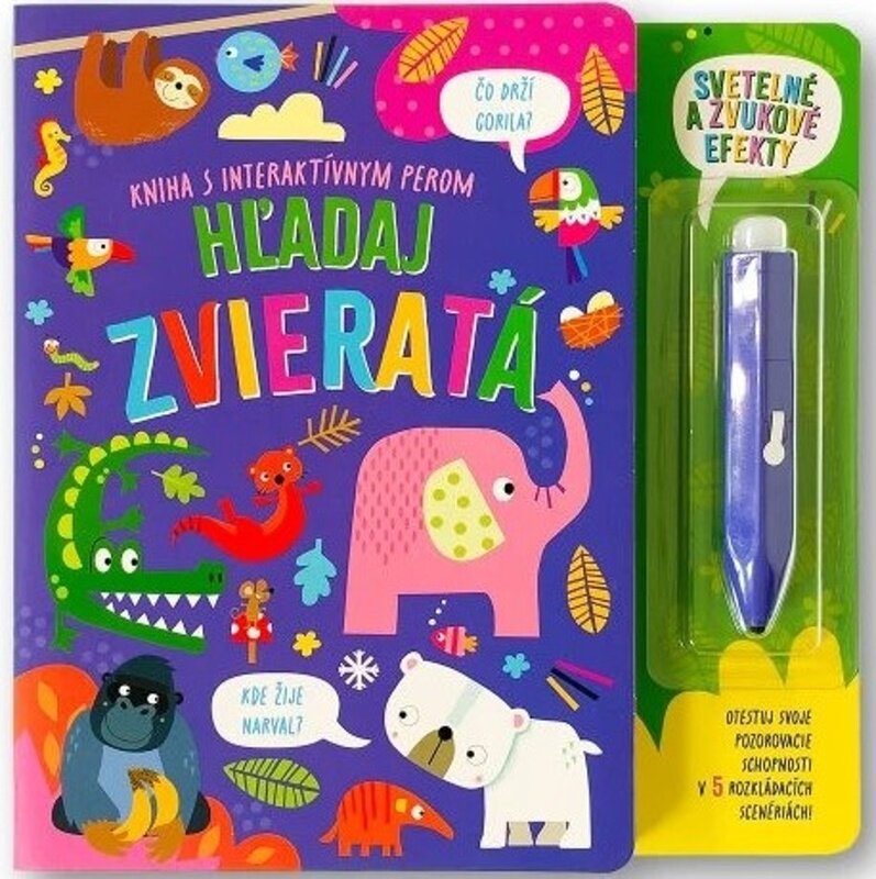 Koľko motýľov vidíš v džungli? Akú farbu má mrož? A kde žijú jazvece? Rozkladacie scenérie so zvieratami a otázky na jednotlivé obrázky otestujú detskú pozornosť a manipulácia s interaktívnym perom precvičí jemnú motoriku. Po zatlačení hrotom pera na čiernu bodku vo farebnom koliesku so správnou odpoveďou sa rozoznejú melódie a rozsvieti zelené svetlo, ktoré deti potešia a povzbudia na hľadanie ďalších správnych odpovedí.