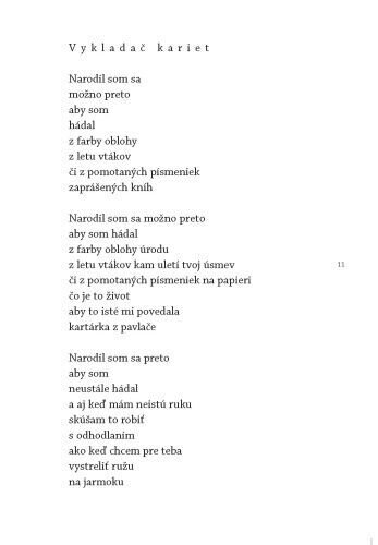 Najnovšia básnická zbierka hudobníka i spisovateľa prináša súbor šesťdesiatich troch básní, z ktorých časť bola už uverejnená v časopisoch ako Romboid, Slovenské pohľady, Literárny tyždenník, Dotyky a Kultúra. Všetky jeho básne silne reflektujú nažité a podobne ako jeho milované blues približujú pocity večného rebela.