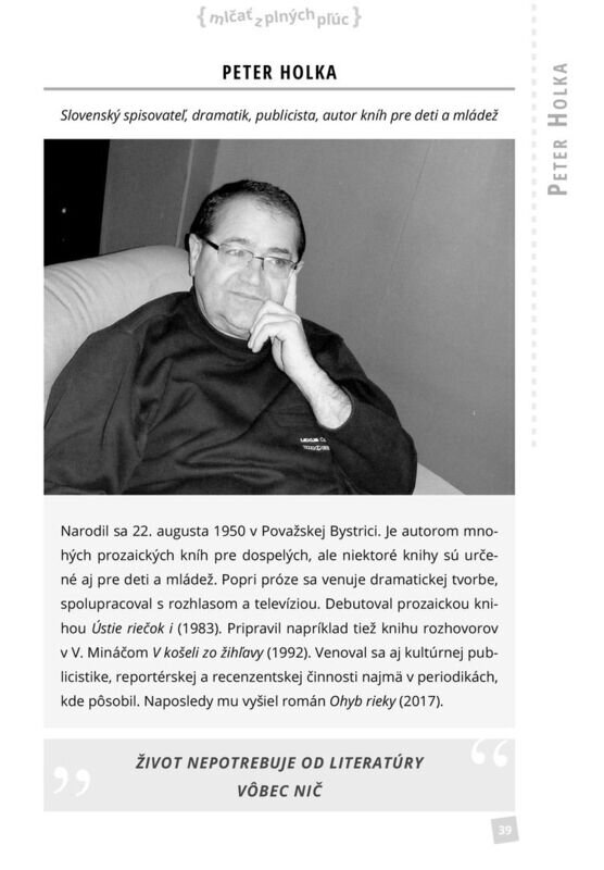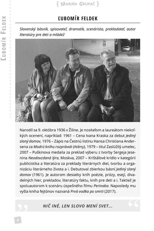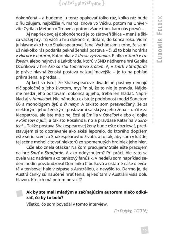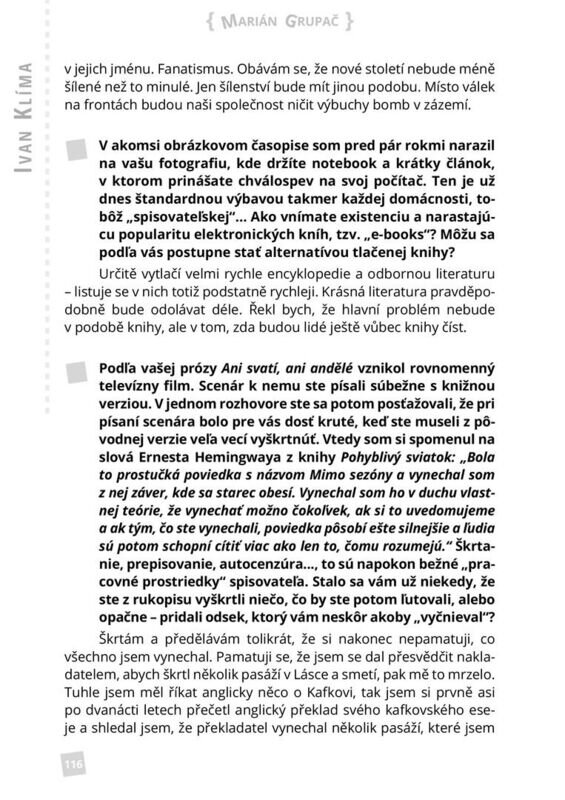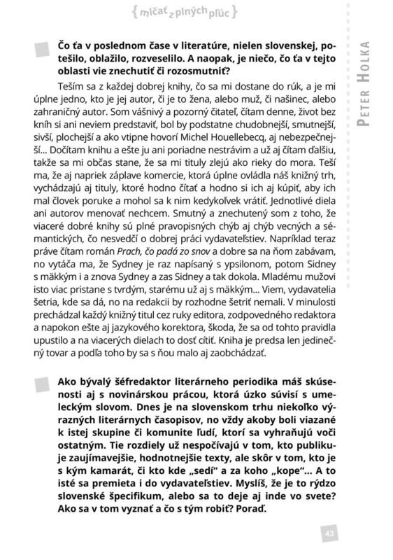 Kniha rozhovorov s osobnosťami slovenskej literatúry a umenia, esejí a recenzií výstižne dokresľuje obraz slovenskej kultúry na začiatku 21. storočia, mapuje literárne dianie, nevyhýba sa však ani témam etiky, umenia, či kultúry v širšom kontexte. Neformálne vyznania oslovených tvorcov, ostré glosy a intenzívne sondy do súčasného diania oslovujú nielen odborníkov, ale i širšiu čitateľskú verejnosť.