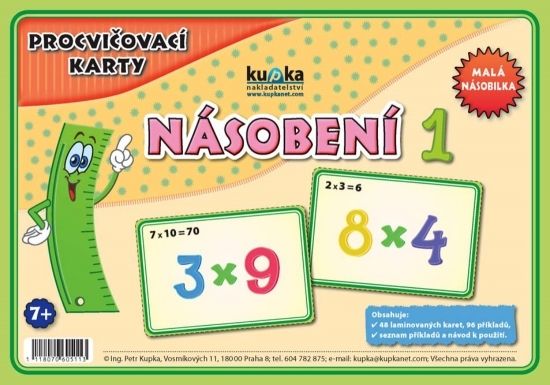 Súbor obsahuje 48 obojstranných kariet veľkosti 10x7 cm (4 obrázky na karte A5 určené na rozstrihanie) s 96 príkladmi na precvičovanie malej násobilky. Výsledok násobenia je uvedený na opačnej strane karty v ľavom hornom rohu. Karty sú určené pre školákov od 2. triedy ZŠ.