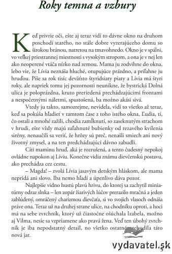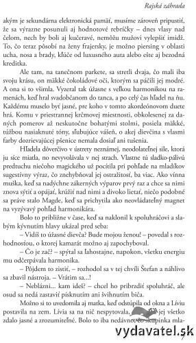 Autobiografický román jubilujúcej spisovateľky, spoluzakladateľky Klubu slovenských prozaičiek Femina, spája prežité s literárnou fikciou. Člení sa na dve časti, prvá nazvaná Roky temna a vzbury opisuje osudy autorkinho otca, notára Zachara, druhá s titulkom Rajská záhrada je dynamickým rozprávaním navodzujúcim mozaiku spomienok. Dielo je umelecky hodnotnou reflexiou subjektívnych vnemov a reminiscencií autorky a zároveň jedným z príspevkov k vyrovnávaniu sa s ťaživými determinantami 20. storočia.