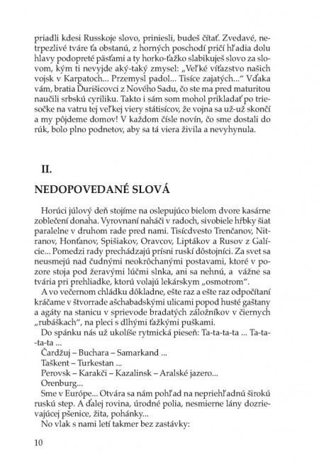 Autobiografické dielo reflektuje obdobie prvej svetovej vojny a krátko po nej, keď sa Mikuláš Gacek dostal na ruskom fronte do zajatia a odtiaľ na Sibír. Ako jeden z mnohých aj on vstúpil do česko-slovenských légií a zúčastnil sa na ich ťažení po Transsibírskej magistrále až do Vladivostoku. Dielo vybavené poznámkami a štúdiou Mgr. Petra Cabadaja sprítomňuje literárnu tvorbu takmer zabudnutého tvorcu a je významným dokumentom doby, ktorá predznamenala ďalší historický vývoj Slovenska.