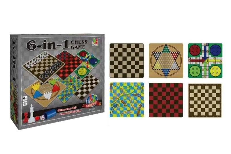 Spoločenská hra 6v1. Hra obsahuje človeče nehnevaj sa, hadíky a rebríky, šach, dámu, čínsku dámu. Pre 2 až 4 hráčov. Nevhodné pre deti do 3 rokov. Odporúčaný vek od 6 rokov. Rozmer hracej plochy - 26,5cm x 26,5cm