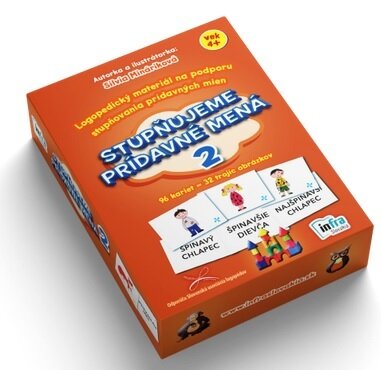 "Zajac je smelý. Rytier je smelší. Najsmelší je chlapec na obrázku. Bazén je hlboký, kaňon je hlbší a najhlbšia je jaskyňa." Aj také obrázky na trénovanie stupňovania prídavných mien nájdete v tejto edupomôcke. Obsahuje nielen frekventované, ale i menej časté prídavné mená (staromódny, ospalý, obratný...), a tak ponúka spojenia rozširujúce slovnú zásobu. Na každej karte je obrázok a z druhej strany slovné spojenie. Každá trojica má svoj znak v rožteku, aby sa karty ľahko triedili a dobre sa s nimi manipulovalo.