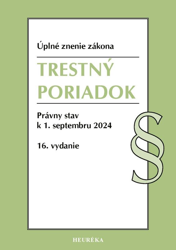 Publikácia obsahuje aktualizované úplné znenie Trestného poriadku č. 301/2005 Z.z. s právnym stavom k 1. septembru 2024 s výraznenými zmenami poslednej novelizácie zákona č. 40/2024 Z.z. s účinnosťou od 15. a 20. marca 2024 a nepriamej novelizácie TP Nálezom Ústavného Súdu SR č. 215/2024 Z.z. s účinnosťou od 6. augusta 2024.