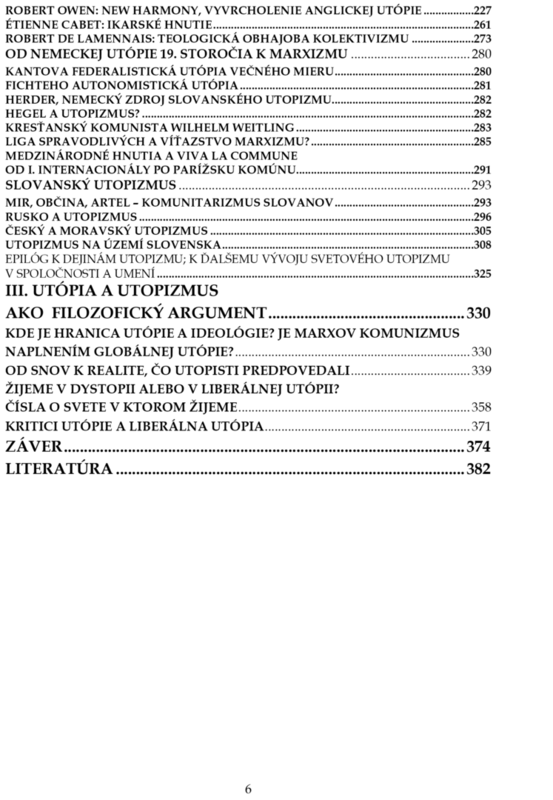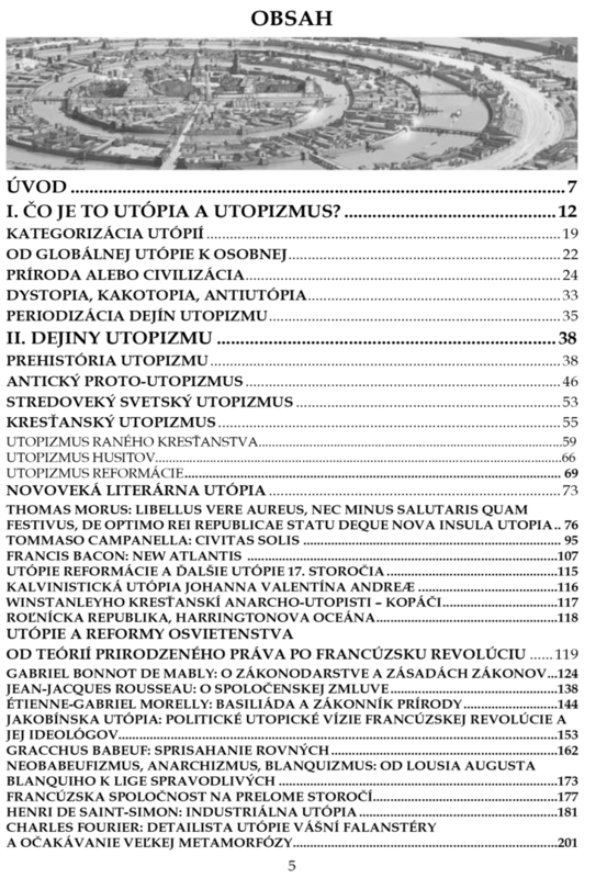 Od šesťdesiatych rokov, kedy vyšiel Zamarovského zborník Utopisti a Šimečkove knihy o utópiách, nevznikla na Slovensku kniha, ktorá by systematicky spracovávala tému dejín utópií a utopizmu z pozície systematickej filozofie. Predložená kniha analyzuje diela autorov, akými boli Thomas More, Tommaso Campanella, Francis Bacon, Henri de Saint-Simon, Charles Fourier či Robert Owen, ale aj zabudnutých mien ako Étienne-Gabriel Morelly, Gabriel Bonnot de Mably, Gracchus Babeuf, Etienne Cabet, Robert de Lamennais, s rozšírením na slovanský (ruský, český a slovenský utopizmus (Gercen, Belinskij, Bolzano, Štúr).