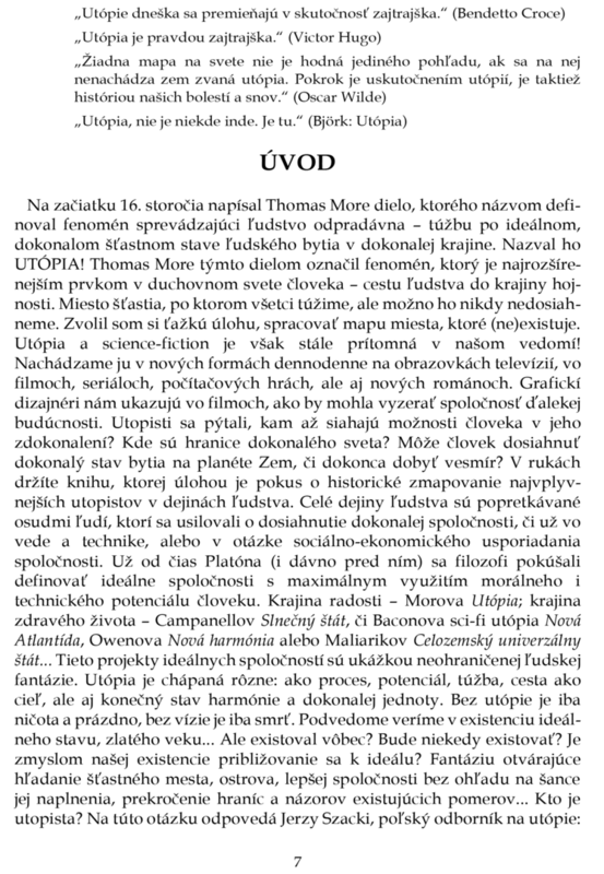 Utópia a science-fiction je však stále prítomná v našom vedomí! Nachádzame ju v nových formách dennodenne na obrazovkách televízií, vo filmoch, seriáloch, počítačových hrách, ale aj nových románoch. Grafickí dizajnéri nám ukazujú vo filmoch, ako by mohla vyzerať spoločnosť ďalekej budúcnosti. Utopisti sa pýtali, kam až siahajú možnosti človeka v jeho zdokonalení? Kde sú hranice dokonalého sveta? Môže človek dosiahnuť dokonalý stav bytia na planéte Zem, či dokonca dobyť vesmír? V rukách držíte knihu, ktorej úlohou je pokus o historické zmapovanie najvplyv-nejších utopistov v dejinách ľudstva. Celé dejiny ľudstva sú popretkávané osudmi ľudí, ktorí sa usilovali o dosiahnutie dokonalej spoločnosti, či už vo vede a technike, alebo v otázke sociálno-ekonomického usporiadania spoločnosti.