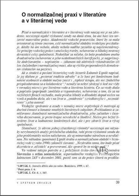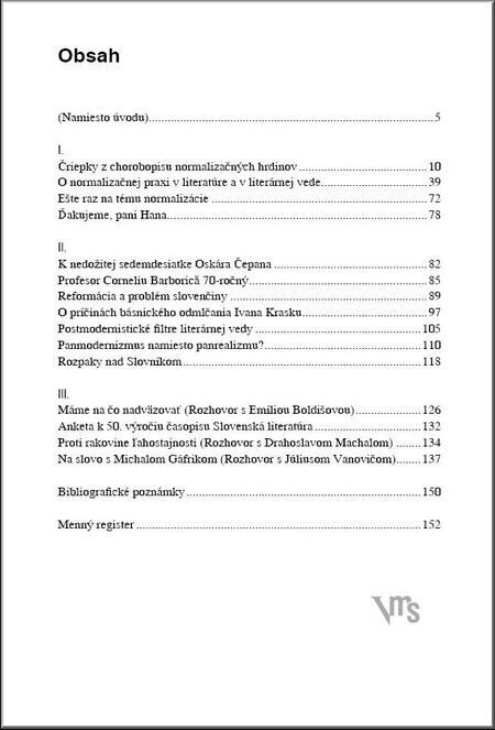 V prvej časti knihy sa autor venuje obdobiu \"normalizácie\" (v živote intelektuála i v literatúre a v literárnej vede). V druhej portrétom, úvahám a kritickej reflexii viacerých kultúrnych javov. Treťou časťou sú rozhovory (a anketa) o rozličných kultúrnych a spoločenských problémoch v širokom zmysle slova.