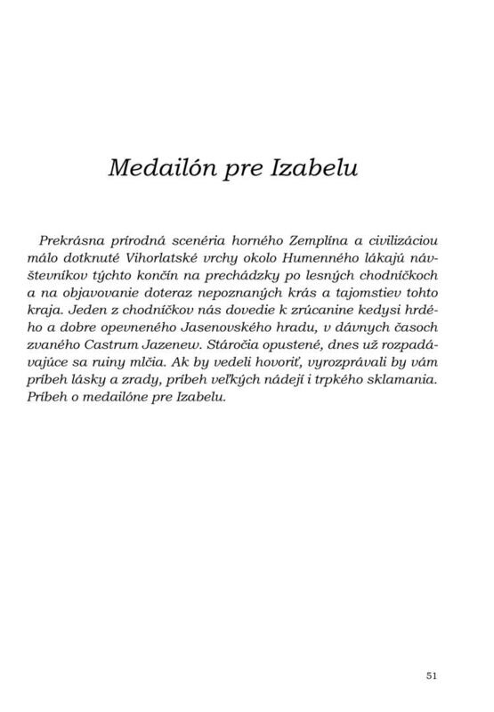 Kniha historických noviel na motívy zemplínskych povestí poodhaľuje zabudnuté tajomstvá kraja a ukazuje, aké strhujúce príbehy vášní, lások aj nenávistí, hrdinských činov i podlej zrady sa skrývajú za strohým opisom udalostí v učebniciach dejepisu. Čitateľ sa dozvie o záhadnom pobočníkovi kráľa Matyáša, o tajomnej jaskyi plnej zlata, prečo mladá Izabela dostala vzácny medailón a Joanes 30 strieborných, aká bola cena za mlčanie záhradníka Zubera...